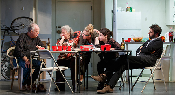 First let me give you some context. The Blake family has gathered together for Thanksgiving dinner, this year at their younger daughter’s new apartment in lower Manhattan. Brigid has moved in with her older boyfriend, Rich, and the place isn’t bad by New York standards. It’s a ground floor apartment, and they have a second floor in the basement of the building, both fully executed by set designer David Zinn (see photo below). Sure, there are bars on the windows, and the trash compactor is crazy loud, and who knows what the hell the neighbors are doing upstairs, but hey, it’s home! They’ve just moved in, and their stuff hasn’t made it to the apartment yet, so it’s a very bare bones Thanksgiving, adding to the creepiness vibe of the place as the thumps get louder and louder upstairs. Brigid’s older sister Aimee is there, and their parents, Erik and Deirdre, have trekked in from Pennsylvania with their grandmother “Momo” who is suffering from the beginnings of dementia. The evening is full of prepping for dinner, exchanging gifts, complaining about the noise, and getting to know the boyfriend (watch a clip here). Because it’s a play (and we all know how plays work), we can guess from the start that this isn’t going to be the smoothest of family dinners, but the way in which the plot unfolds is so seamless that it doesn’t feel the least bit contrived. Nothing in the entire 90 minutes seems false or forced. Things unravel like a sweater as old reflexes kick in, snide comments are exchanged, and secrets are revealed.