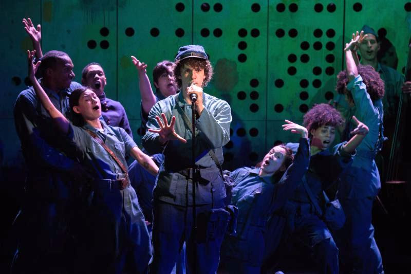 Alvarez also wrote the book and lyrics, and he co-wrote the music with Tunis and the incredibly talented percussionist Eric Farber (also a member of The Lisps) who plays various “contraptions” in the piece. They are joined by a wonderfully diverse cast of ten actors who play the ensemble of soldiers in addition to providing the impressive live accompaniment.
